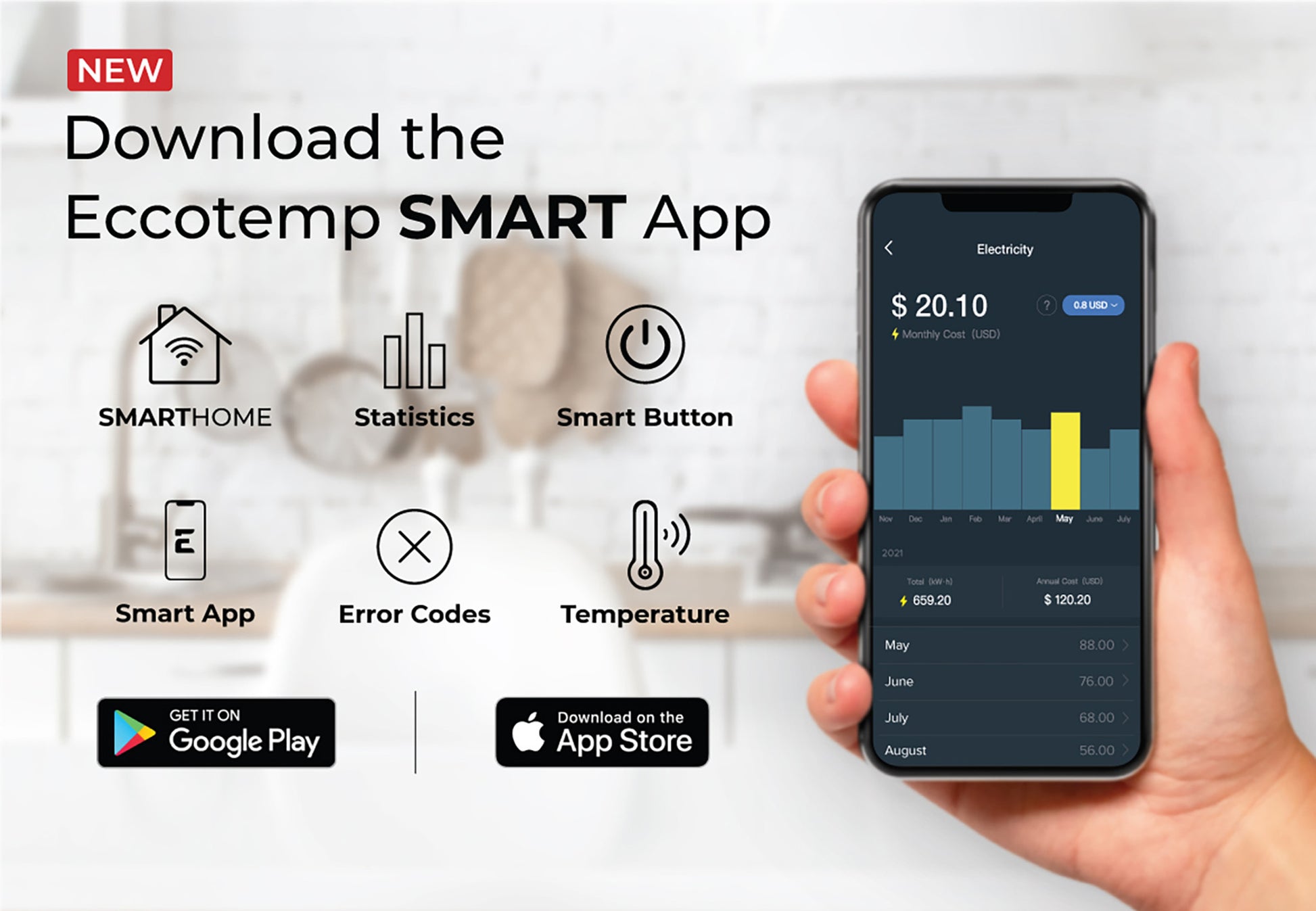The patent pending Eccotemp ESH 2.5 pairs with Amazon Alexa and Google Home to allow smart voice commands such as: “Alexa, turn my Mini up to 110 degrees” or “Hey Google, turn my Mini off.” Use the Eccotemp mobile app to track energy consumption, adjust temperatures or even detect product and network errors. Want to know the actual energy cost when using the Eccotemp ESH SMARTHOME Mini Tank Water Heater? Our mobile app allows you to see real consumption statistics with an associated dollar amount.