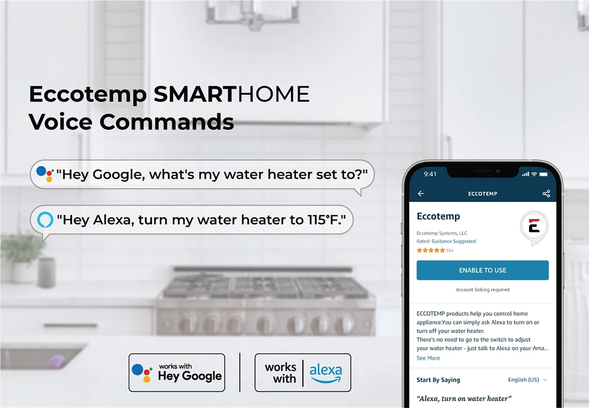 • Patent Pending, SMARTHOME ready, compatible with Amazon Alexa and Google Assistant. The Eccotemp SMARTHOME app allows you to adjust temperatures, turn your Mini on/off and access to advanced energy usage statistics using advanced voice controls.