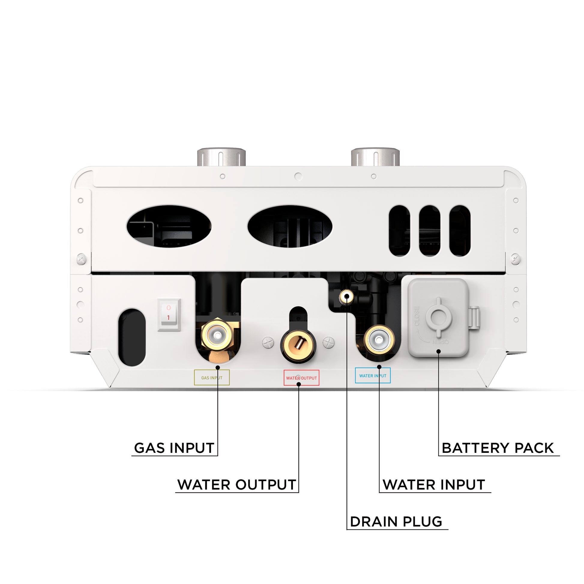 • Features a Safety Shut Off Switch that automatically shuts down the water heater when tilted more than 45 degrees.
