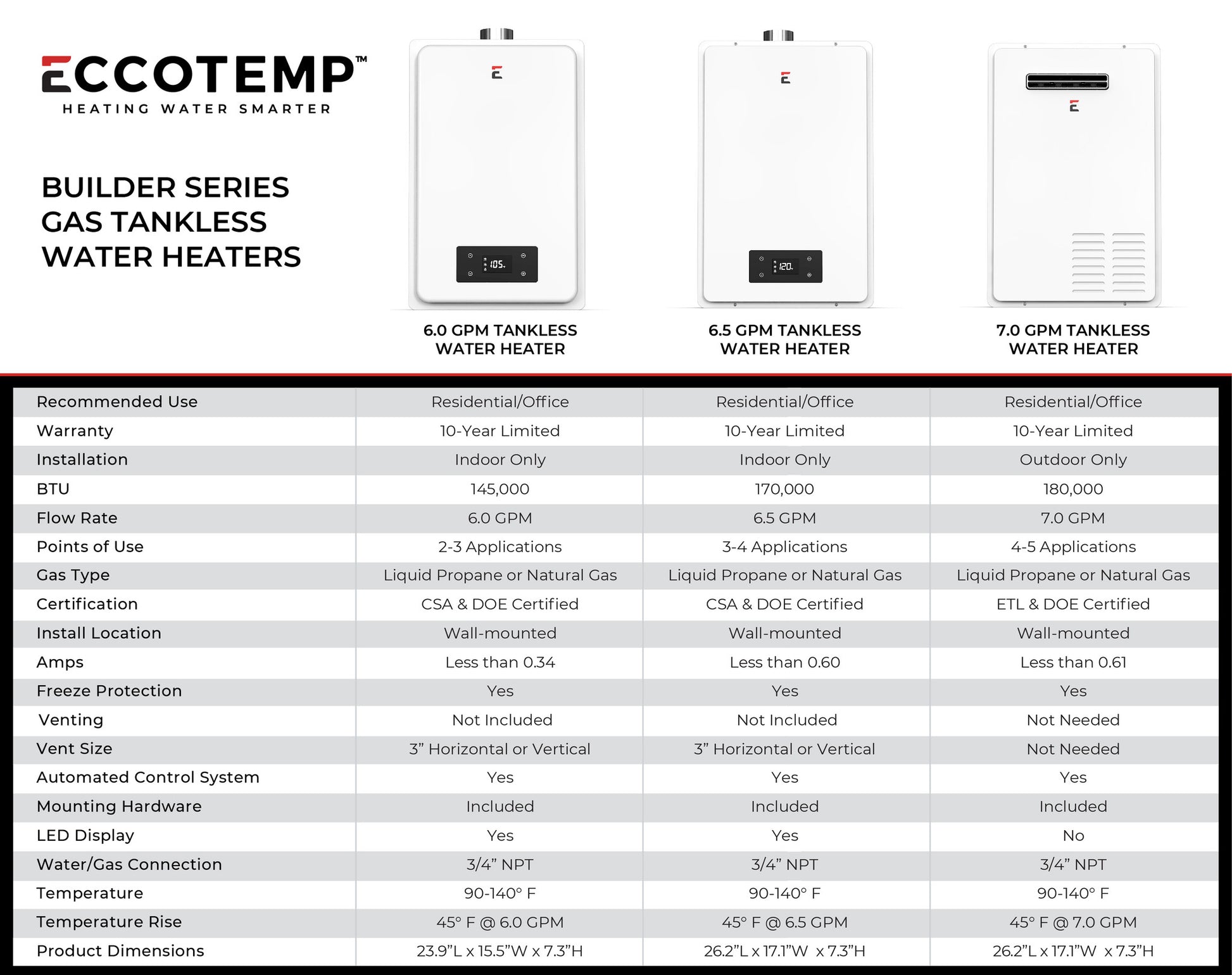 • The 6GB Builder Series is designed for indoor installation only and requires 3-inch venting. Make installation a breeze using the Eccotemp 3" Horizontal Vent Kit or 3” Vertical Vent Kit (purchased separately).